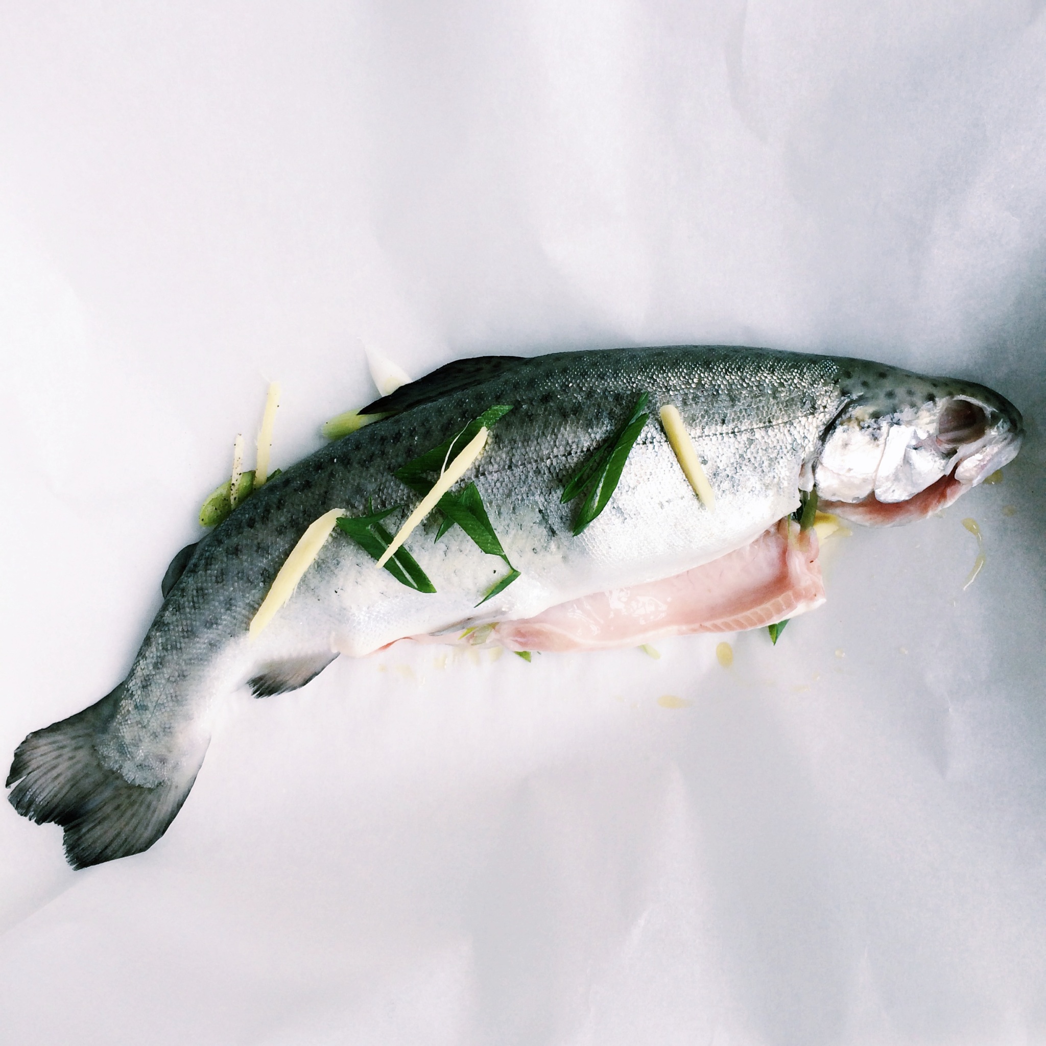 Leg nu de forellen op het bakpapier en gebruik de helft van de overgebleven gember en bosui om die zowel op als in de forellen te stoppen.
