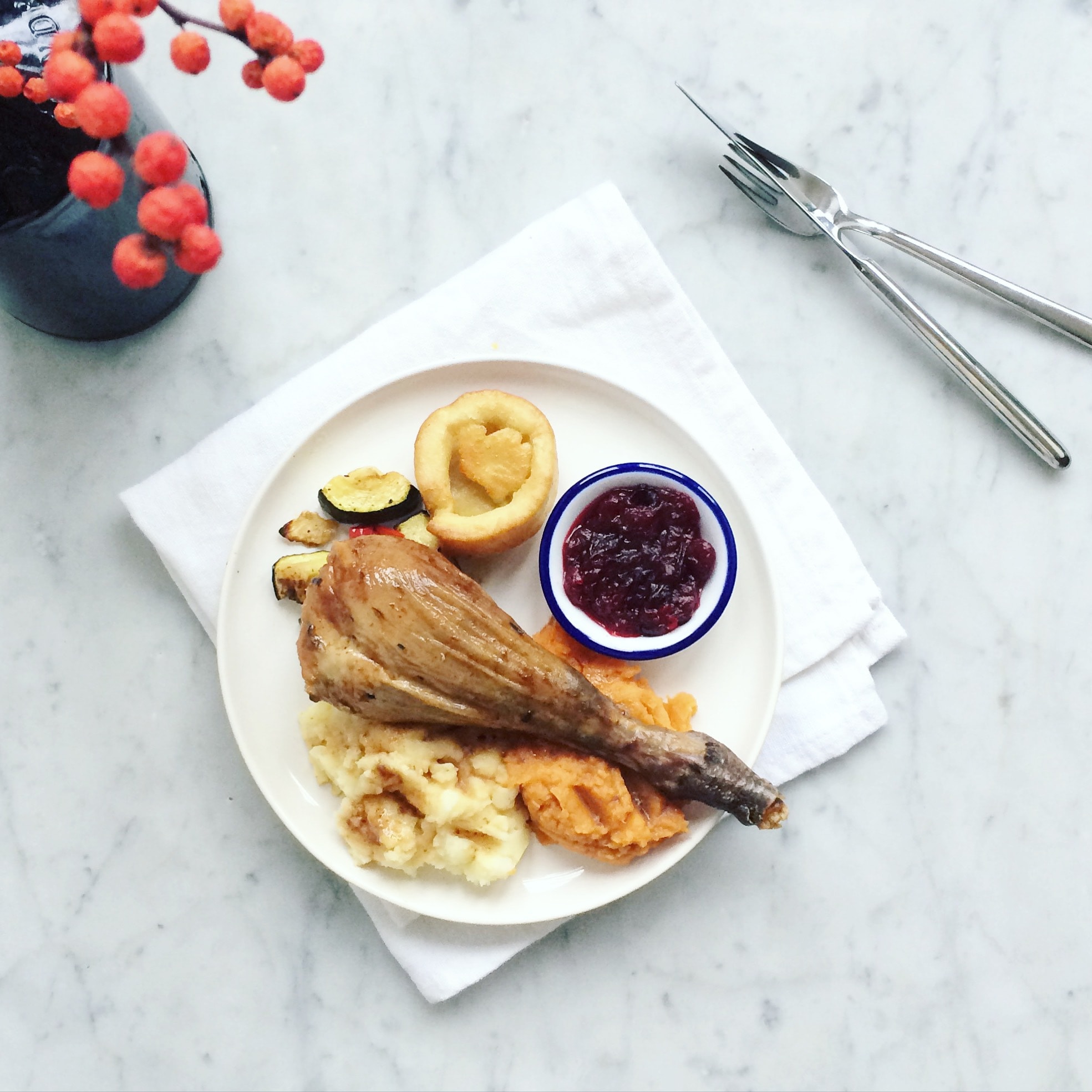 De BF en ik maakten dus de Kalkoen en de rest van de familie zorgde voor de bijgerechten. Aardappelpuree, zoete aardappelpuree, gegrilde groenten en een toetje. Ik kon het niet laten en maakte ook nog eens, Cranberry saus (recept vind je hier), Yorkshire Puddings en een Pecan Pie erbij. Genieten dus.