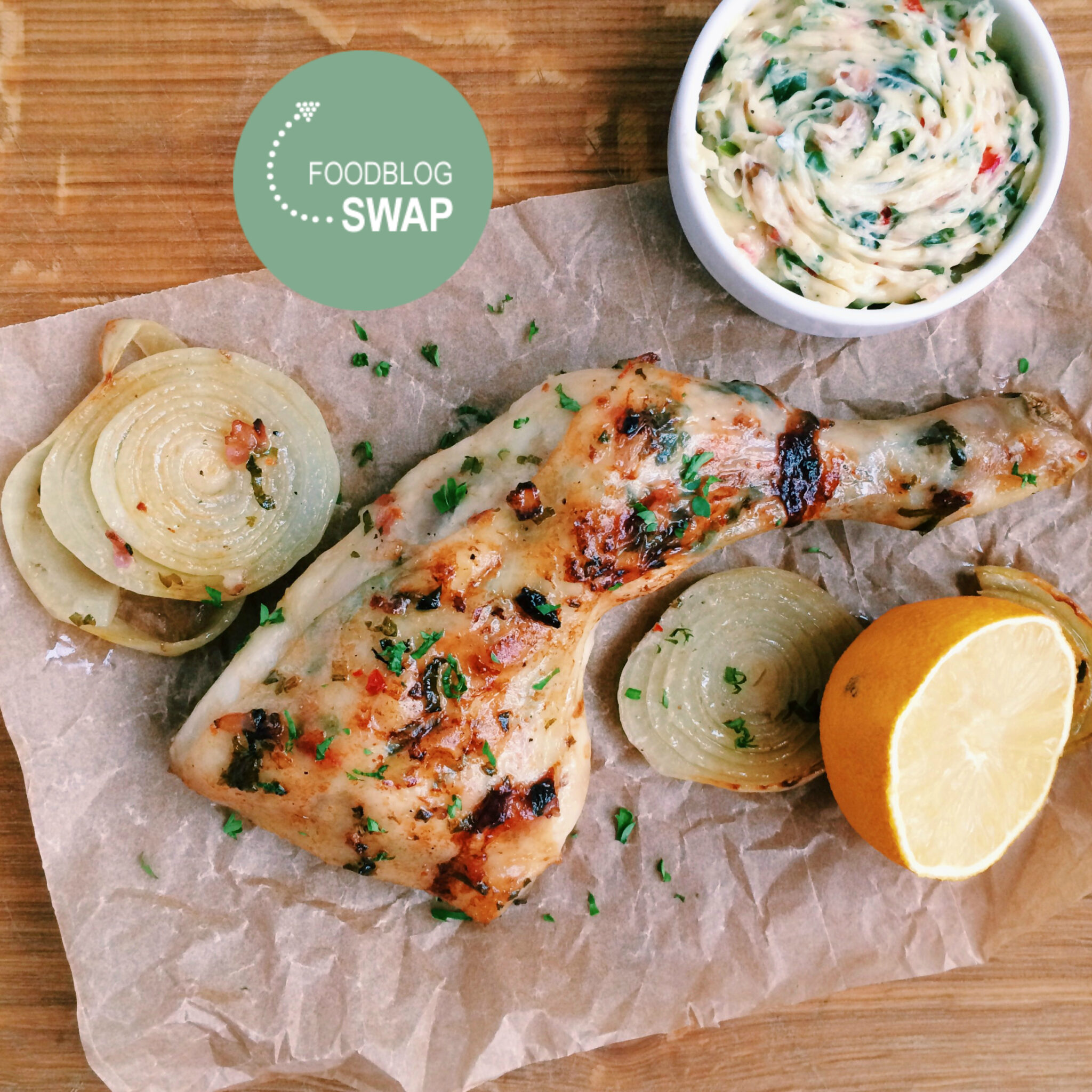 Na een tijdje niet meegedaan te hebben aan de foodblogswap vond ik het wel weer leuk om een keertje mee te doen. Deze keer kreeg ik de blog van Melanie toegewezen: Piccanti. Na enkele keren haar blog goed te hebben doorgespit wist ik eigenlijk nog steeds niet wat ik wilde maken. Er waren zoveel lekkere dingen op haar blog, maar ik had wel wat favorieten. Zo bleven de Jerk chicken en kruidenboter wel door mn hoofd spoken. Nadat ik een aflevering van de nieuwste Jamie Oliver serie Comfort food had bekeken wist ik precies wat ik wilde maken. Gezien het feit het een foodblogswap is en ik er mijn eigen draai aan wilde geven, heb ik uiteindelijk het recept iets aangepast. Melanie gebruikte de kruidenboter om te smeren op een vers afgebakken stokbroodje, ik om mijn kippendijen ermee te pimpen.