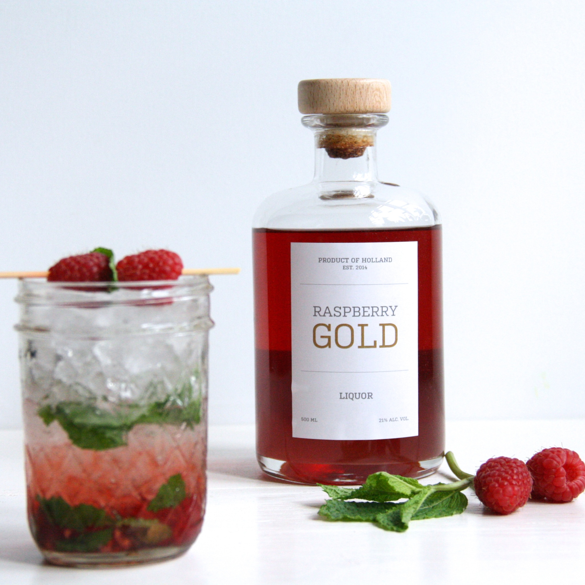 Schenk nu de Raspberry Gold (50ml) in de glazen en doe er gecrushed ijs bovenop.