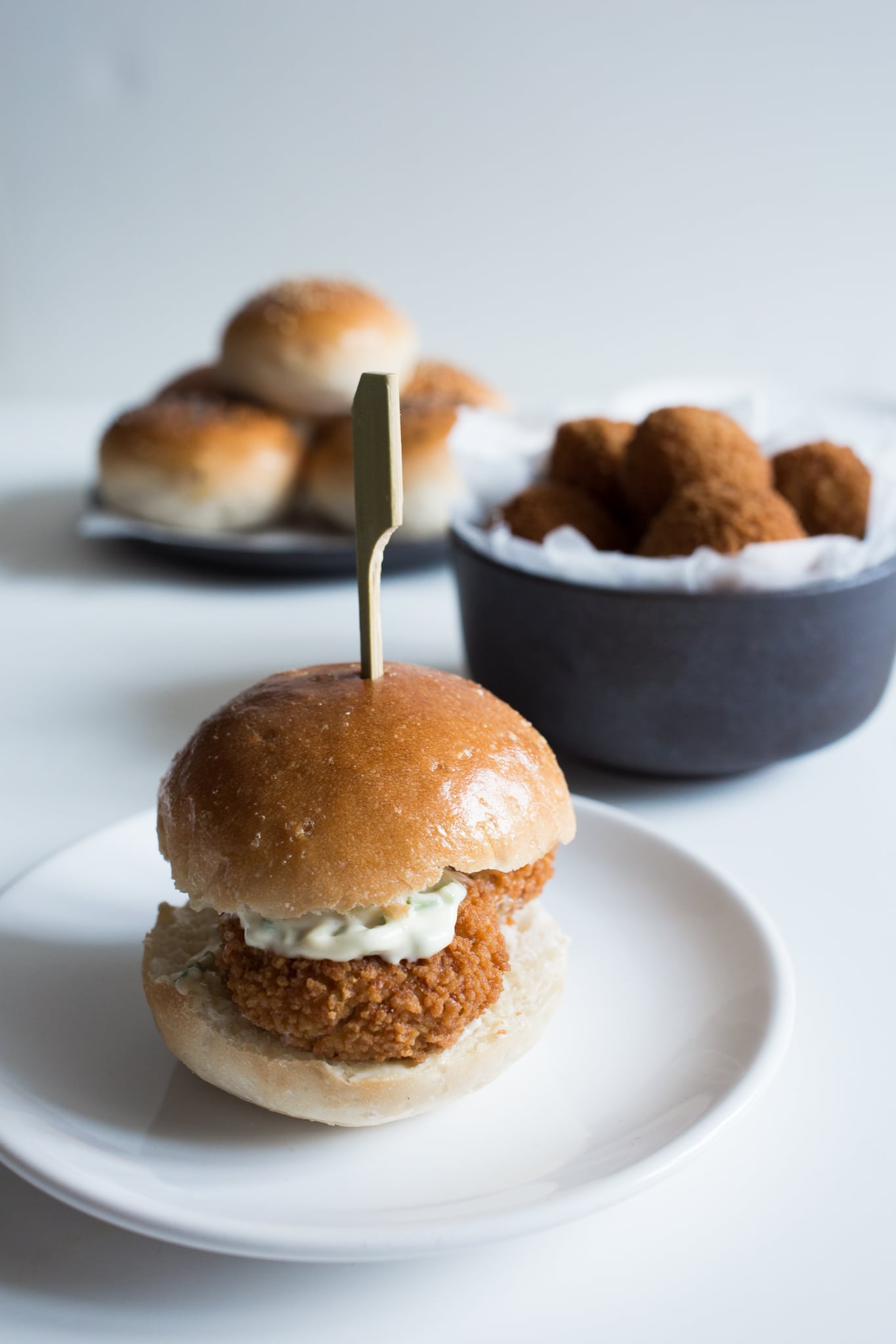 Snijdt de mini burgertjes open en besmeer ze met wat mostermayo.