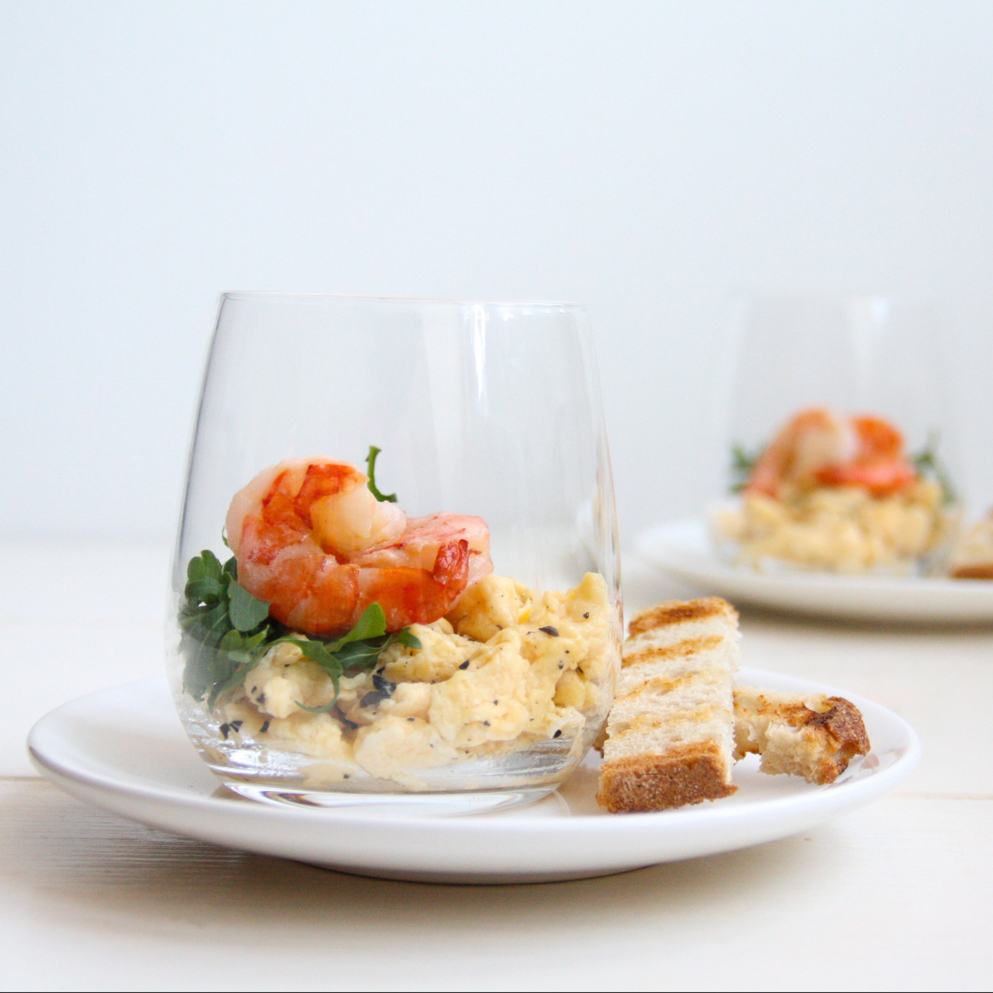 Neem 4 glaasjes en leg bij elke op de bodem wat roerei, wat rucola en 2 garnalen.