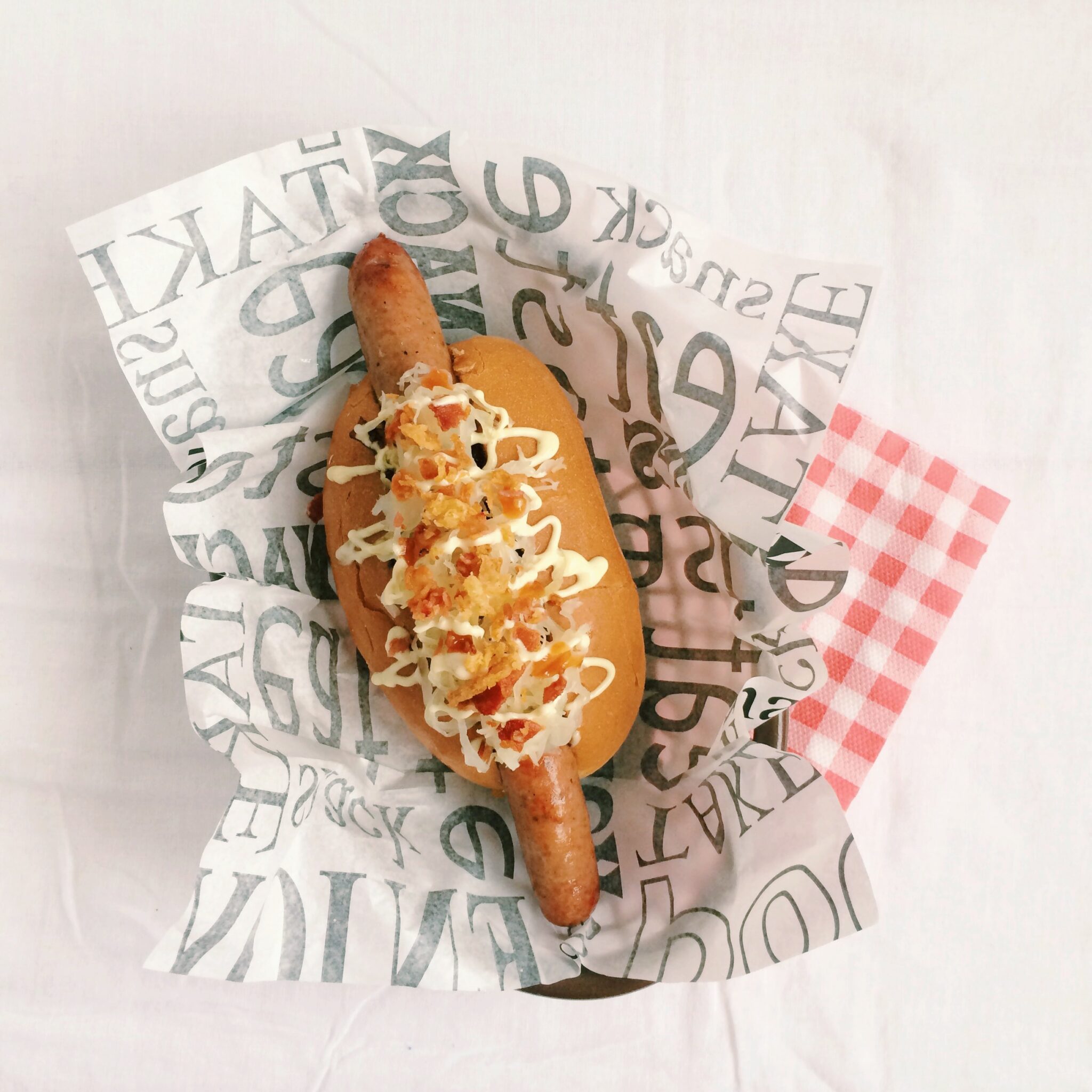 Start assembling your hot dog with some caramelized onions, bacon, sauer kraut, mustard mayo, fried onions, drizzle with Sri Racha sauce and eat away!